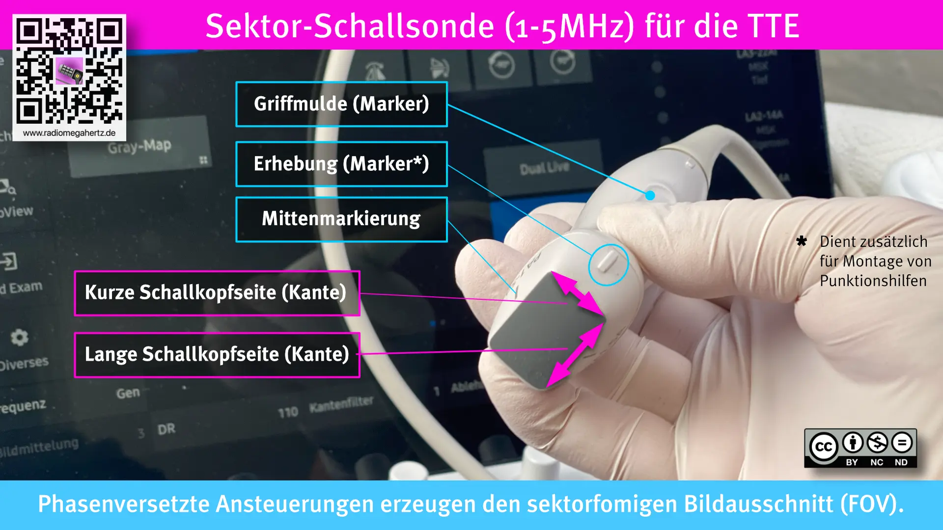 Die Abbildung zeigt eine typische Sektorsonde mit den für die transthorakale Echokardiografie wichtigen haptischen Markierungen. Außerdem ist erkennbar, dass die Schallkopffläche, der Footprint, nicht quadratisch, sondern rechteckig ist. Es sind eine lange und eine kurze Kante vorhanden (siehe auch weiter unten „Sondenmanöver”).